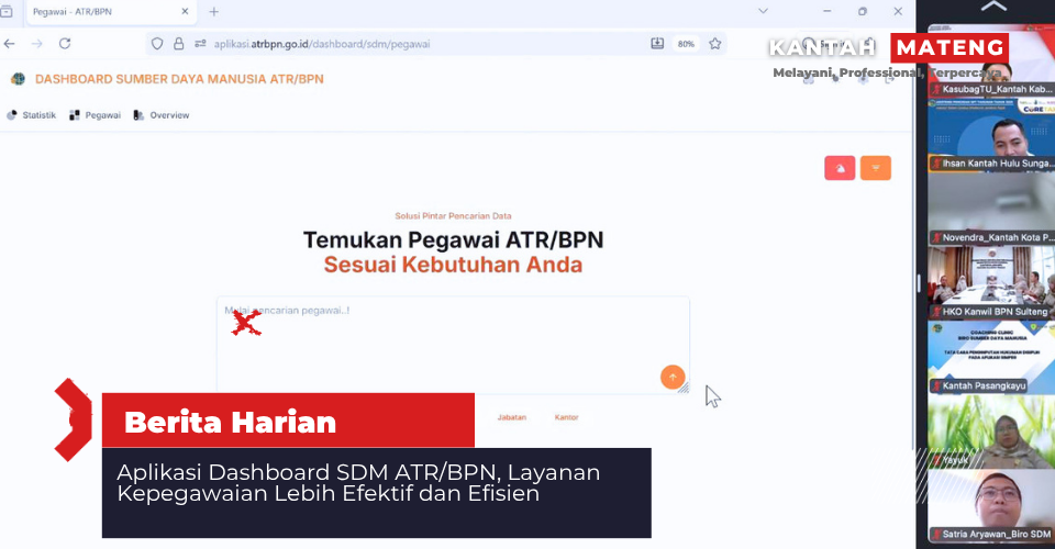 Mamuju Tengah, BKM – Kementerian Agraria dan Tata Ruang/Badan Pertanahan Nasional (ATR/BPN) tengah mengembangkan aplikasi Dashboard Sumber Daya Manusia (SDM) guna mendukung proses mutasi dan promosi pegawai agar lebih efektif dan efisien.