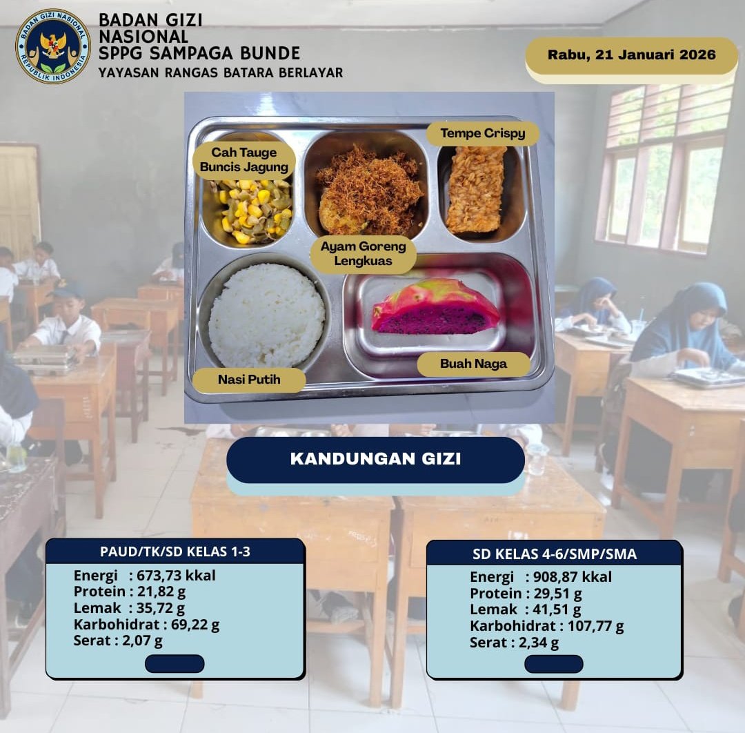 MAMUJU, BKM – Satuan Pelayanan Program Gizi (SPPG) Sampaga Bunde yang berlokasi di Kecamatan Sampaga, Kabupaten Mamuju, terus berkomitmen menjalankan program pemenuhan gizi bagi peserta didik. Pada Rabu (21/01/2026), SPPG di bawah naungan Yayasan Rangas Batara Berlayar ini menyajikan menu makan siang bergizi seimbang yang dirancang khusus untuk mendukung tumbuh kembang siswa di berbagai jenjang pendidikan.
