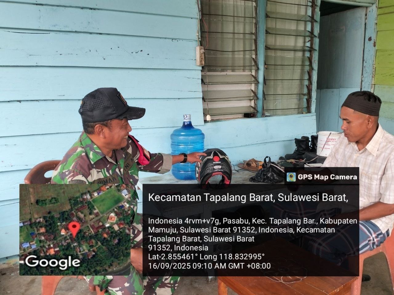 MAMUJU, BKM – Babinsa Koramil 1418-02/Tapalang, Sertu Ahmad, melaksanakan Pengumpulan Data Teritorial (Puldata) di wilayah Kecamatan Tapalang. Kegiatan ini dilakukan sebagai bagian dari tugas pokok Babinsa dalam memperbarui data kewilayahan sekaligus mempererat komunikasi dengan masyarakat. Selasa (16/9/2025).