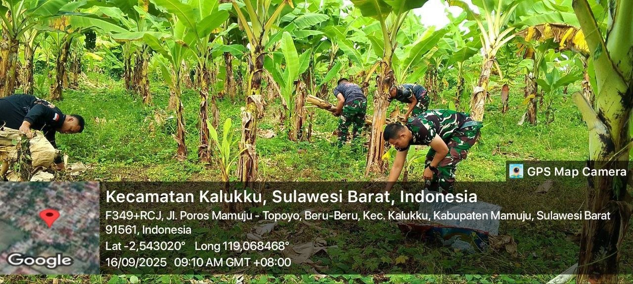 MAMUJU, BKM – Babinsa Koramil 1418-03/Kalukku melaksanakan kegiatan perawatan tanaman pisang cavendis dan pepaya di lahan Korem yang dikelola oleh Kodim 1418/Mamuju, berlokasi di Dusun Taraweh, Desa Beru-beru, Kecamatan Kalukku, Kabupaten Mamuju. Selasa (16/09/2025).