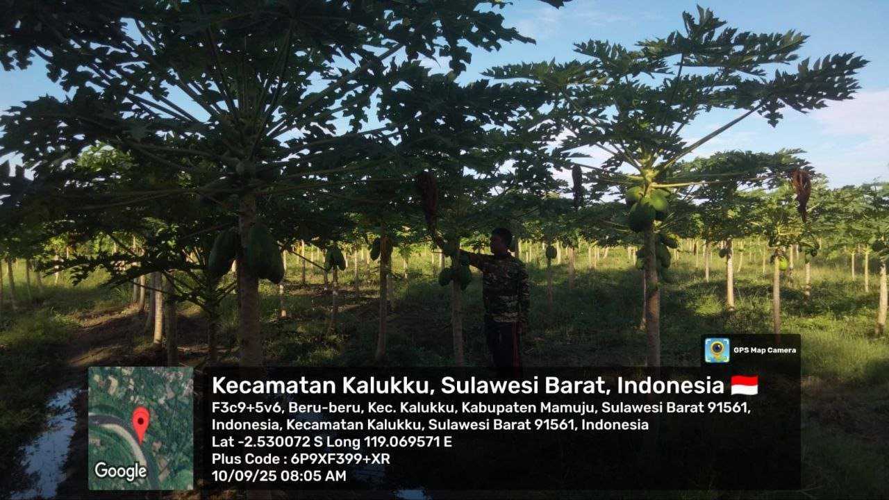 MAMUJU, BKM – Babinsa Koramil 1418-03/Kalukku melaksanakan kegiatan perawatan ketahanan pangan di lahan Korem 142/Tatag yang berada di Dusun Taraweh, Desa Beru-beru, Kecamatan Kalukku, Kabupaten Mamuju. Perawatan kali ini difokuskan pada tanaman pisang cavendis dan pepaya yang menjadi salah satu komoditas unggulan dalam program ketahanan pangan di wilayah tersebut. Rabu (10/9/2025).