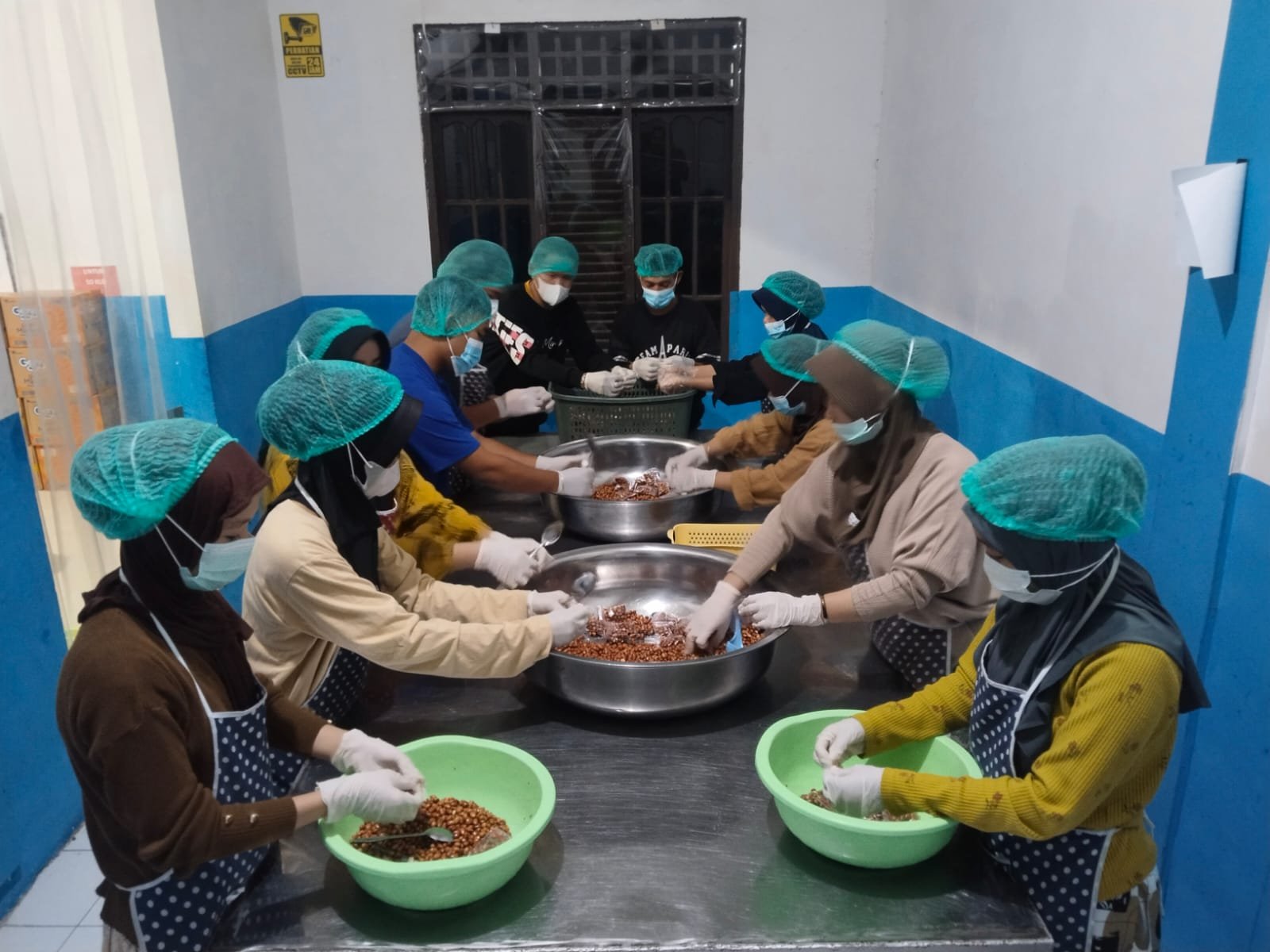 Dalam pantauan di lokasi produksi, suasana pengolahan makanan berjalan dengan sangat tertib mengikuti Standar Operasional Prosedur (SOP) kesehatan. Para relawan terlihat menggunakan perlengkapan pelindung diri lengkap, mulai dari penutup kepala (hairnet), masker medis, hingga sarung tangan steril.