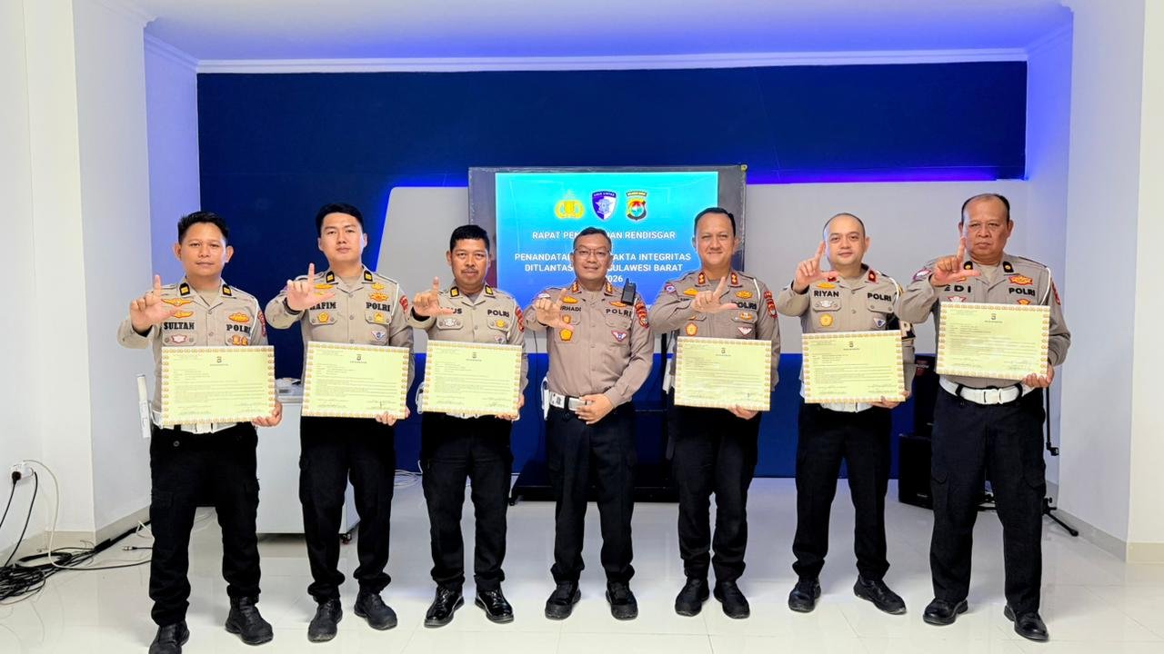 SULBAR, BKM — Direktur Lalu Lintas Polda Sulbar Kombes Pol Nurhadi Ismanto dalam rapat penyerahan Rendisgar dan penandatangan pakta integritas bagi seluruh Subdit jajaran Direktorat Lalu Lintas (Ditlantas) Polda Sulbar menekankan pentingnya pengelolaan anggaran yang bertanggung jawab, Jumat (9/1/26) di Aula Kantor BPKB.