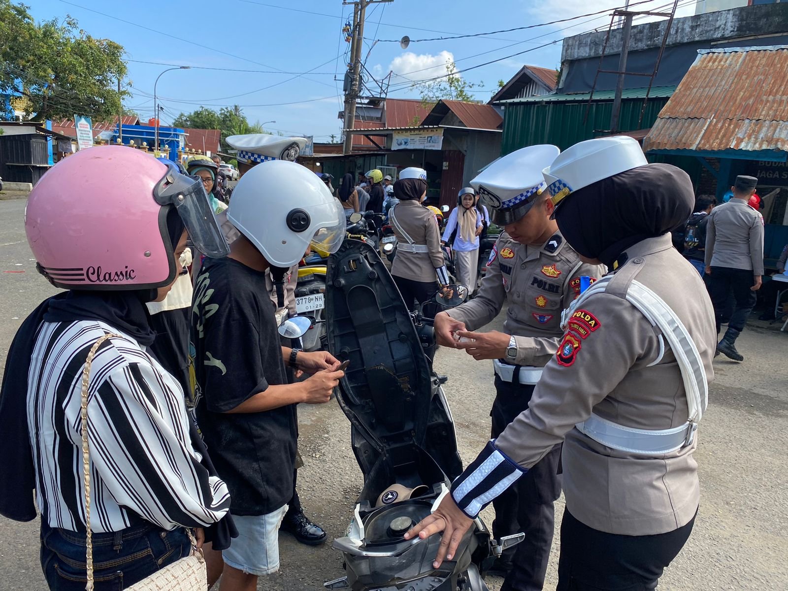 Suasana tertib dan kondusif terlihat di sepanjang jalur dua. Satu per satu pengendara yang melintas dihentikan dengan ramah. Petugas memeriksa kelengkapan surat-surat kendaraan, seperti SIM dan STNK, serta memastikan kondisi fisik kendaraan memenuhi standar keselamatan, termasuk spion, plat nomor dan penggunaan helm standar SNI bagi pengendara sepeda motor.