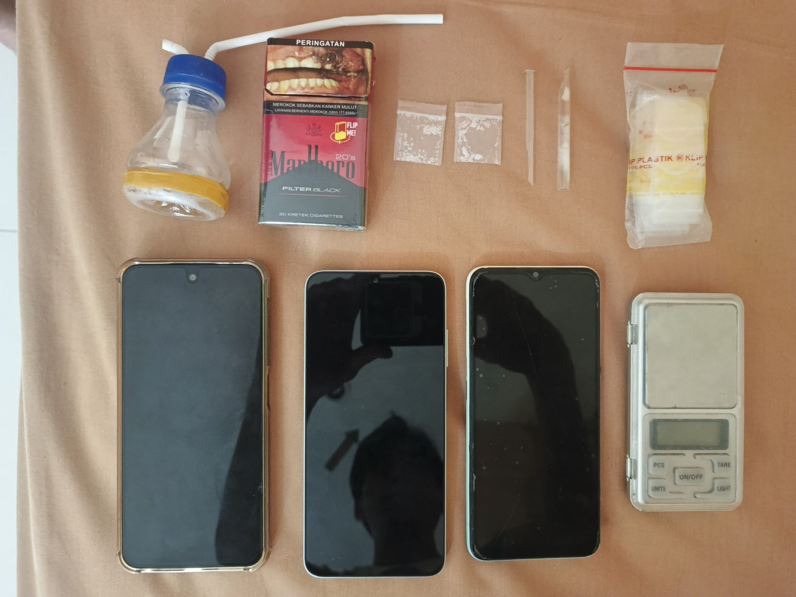 Dari penggeledahan yang dilakukan, petugas menyita barang bukti berupa dua saset kecil kristal bening diduga sabu, satu unit timbangan digital, satu pack saset kosong (100 lembar), satu alat isap sabu (bong), satu pireks kaca, satu bungkus rokok merah dan tiga unit handphone (itel, Samsungdan Oppo). Seluruh barang bukti ditemukan dalam penguasaan SP dan diakui sebagai miliknya.