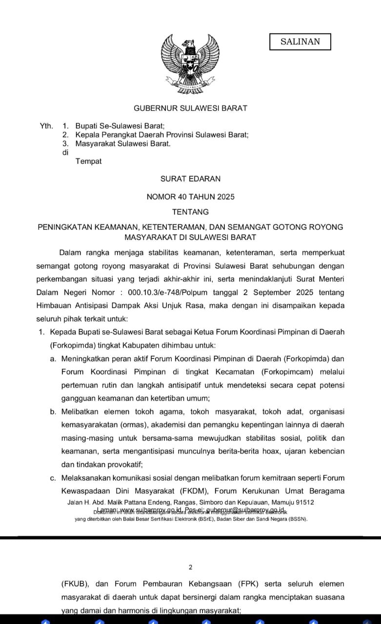 SULBAR, BKM – Gubernur Sulbar, Suhardi Duka, menerbitkan Surat Edaran (SE) Nomor 40 Tahun 2025 tentang Peningkatan Keamanan, Ketenteraman, dan Semangat Gotong Royong Masyarakat di Sulawesi Barat, yang ditandatangani pada Rabu, 10 September 2025.