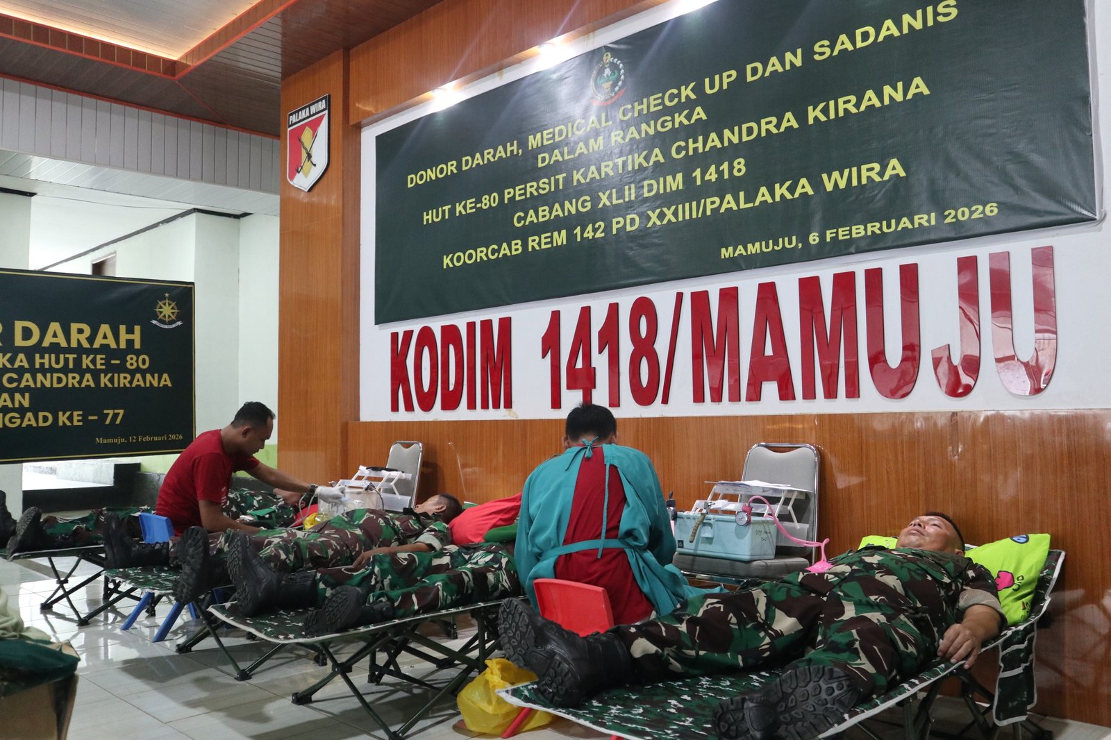 MAMUJU, BKM – Dalam rangka memperingati Hari Ulang Tahun (HUT) ke-80 Persit Kartika Chandra Kirana, Kodim 1418/Mamuju menggelar aksi kemanusiaan berupa Donor Darah, Medical Check Up (MCU), dan pemeriksaan Sadanis. Kegiatan yang dipusatkan di Markas Kodim 1418/Mamuju, Jalan Ahmad Yani, ini menjadi bukti nyata kepedulian organisasi istri prajurit terhadap kesehatan masyarakat, Jumat (6/2/2026).