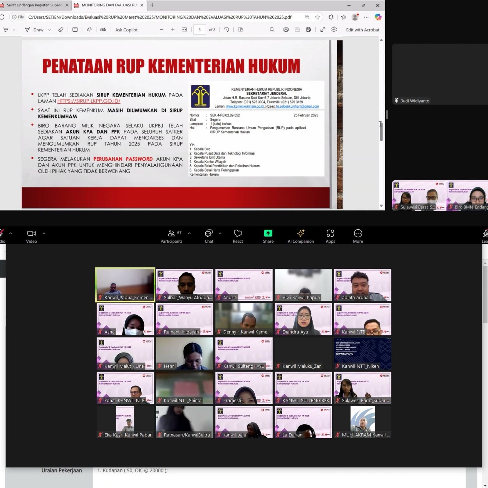 MAMUJU, BKM – Kantor Wilayah Kementerian Hukum (Kemenkum) Sulawesi Barat turut serta dalam kegiatan Supervisi dan Evaluasi Penyusunan Rencana Umum Pengadaan (RUP) Kementerian Hukum yang diselenggarakan secara virtual pada Selasa, 4 Maret 2025.