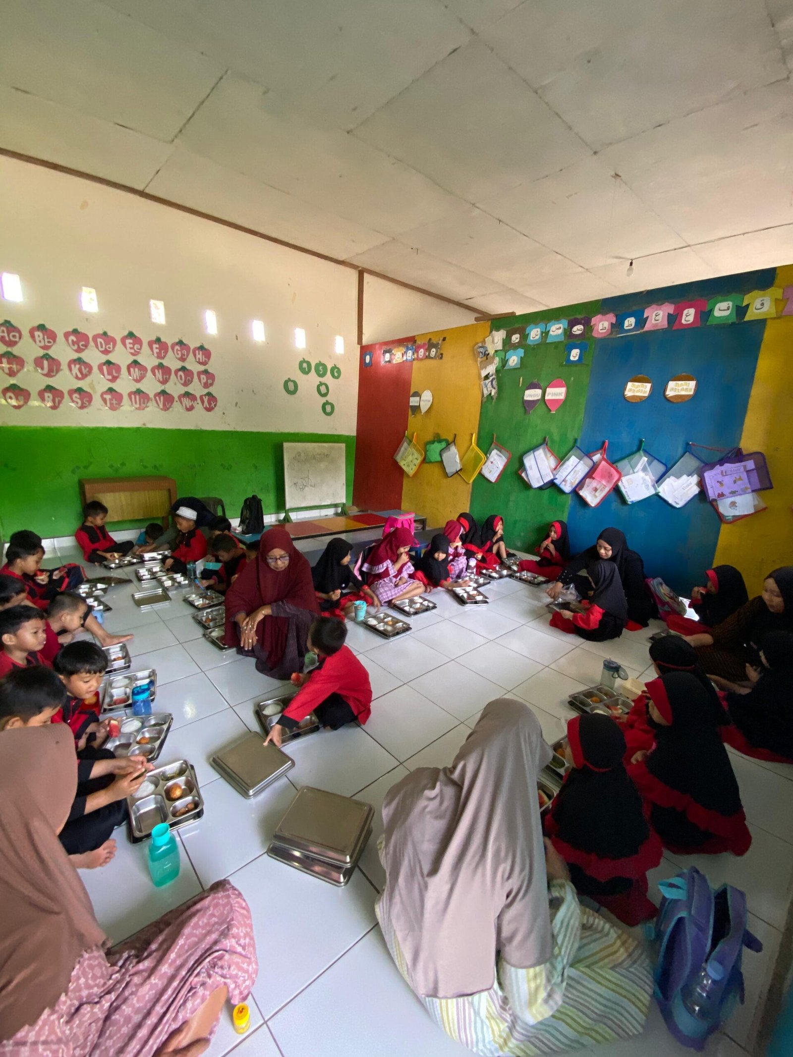 Selama kegiatan berlangsung, para guru pendamping turut mengawasi dan membimbing anak-anak, mulai dari mencuci tangan sebelum makan hingga berdoa bersama. Suasana kebersamaan begitu terasa saat para siswa menikmati hidangan mereka dengan lahap.