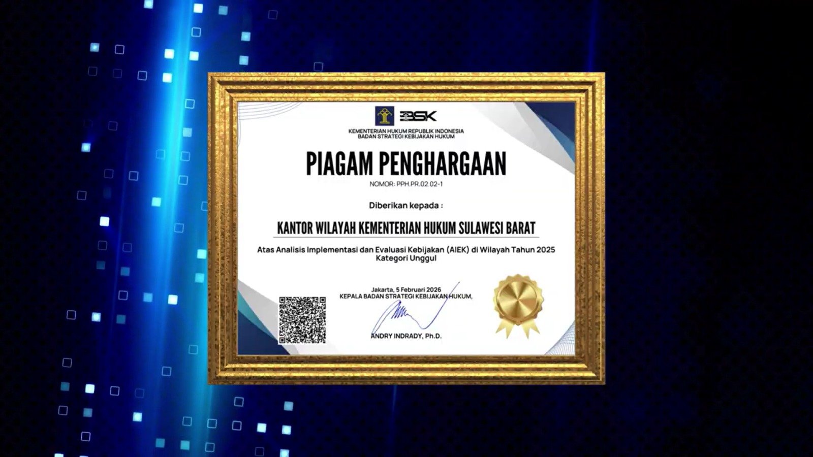 MAMUJU, BKM – Kantor Wilayah (Kanwil) Kementerian Hukum (Kemenkum) Sulawesi Barat kembali mengukir prestasi gemilang di tingkat nasional. Kanwil Kemenkum Sulbar berhasil membawa pulang penghargaan Kategori Unggul dalam ajang Analisis Implementasi dan Evaluasi Kebijakan (AIEK) Tahun 2025 yang diselenggarakan oleh Badan Strategi Kebijakan (BSK) Hukum Kemenkum.