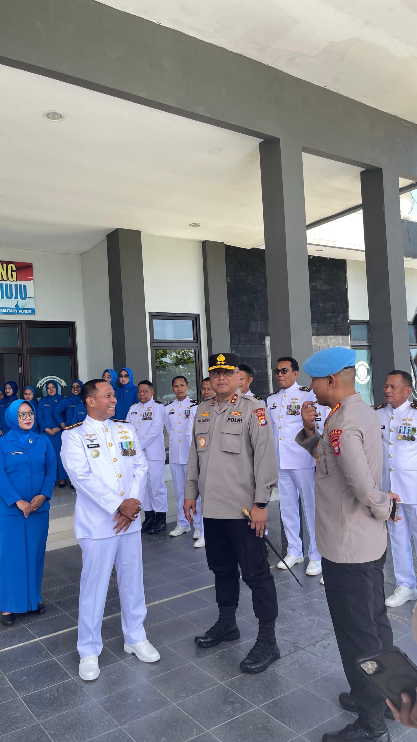Kedatangan Kapolda Sulbar beserta rombongan disambut hangat oleh Komandan Lanal (Danlanal) Mamuju beserta seluruh personel dengan penuh penghormatan. Suasana akrab dan penuh kekeluargaan langsung terasa saat Kapolda memasuki Mako Lanal.