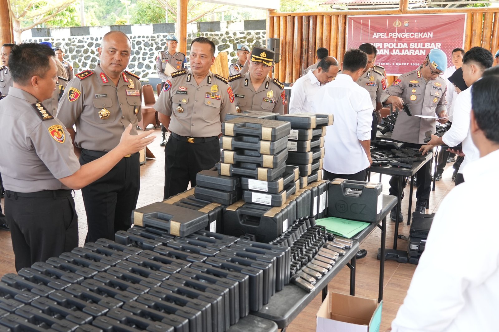 SULBAR, BKM – Guna memastikan seluruh senjata api (senpi) organik yang dimiliki dalam keadaan terawat baik dan digunakan secara sesuai aturan oleh personel, Kapolda Sulawesi Barat Irjen Pol Adi Deriyan melakukan pengecekan menyeluruh, Senin (9/3/26) di tribun Mapolda Sulbar.