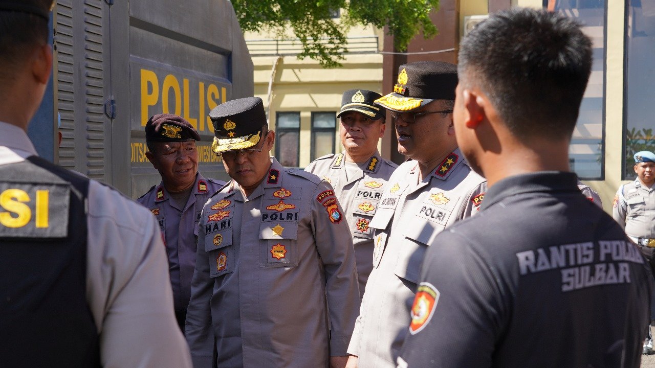 MAMUJU, BKM – Kapolda Sulawesi Barat, Irjen Pol Adi Deriyan Jayamatra, didampingi Wakapolda dan jajaran pejabat utamanya, melakukan pengecekan terhadap kendaraan taktis yang disiagakan untuk mengamankan aksi unjuk rasa. Pengecekan ini dilakukan sebagai langkah antisipasi terhadap potensi kerusuhan dan tindakan anarkis yang mungkin terjadi selama demonstrasi, Senin (1/9/25).