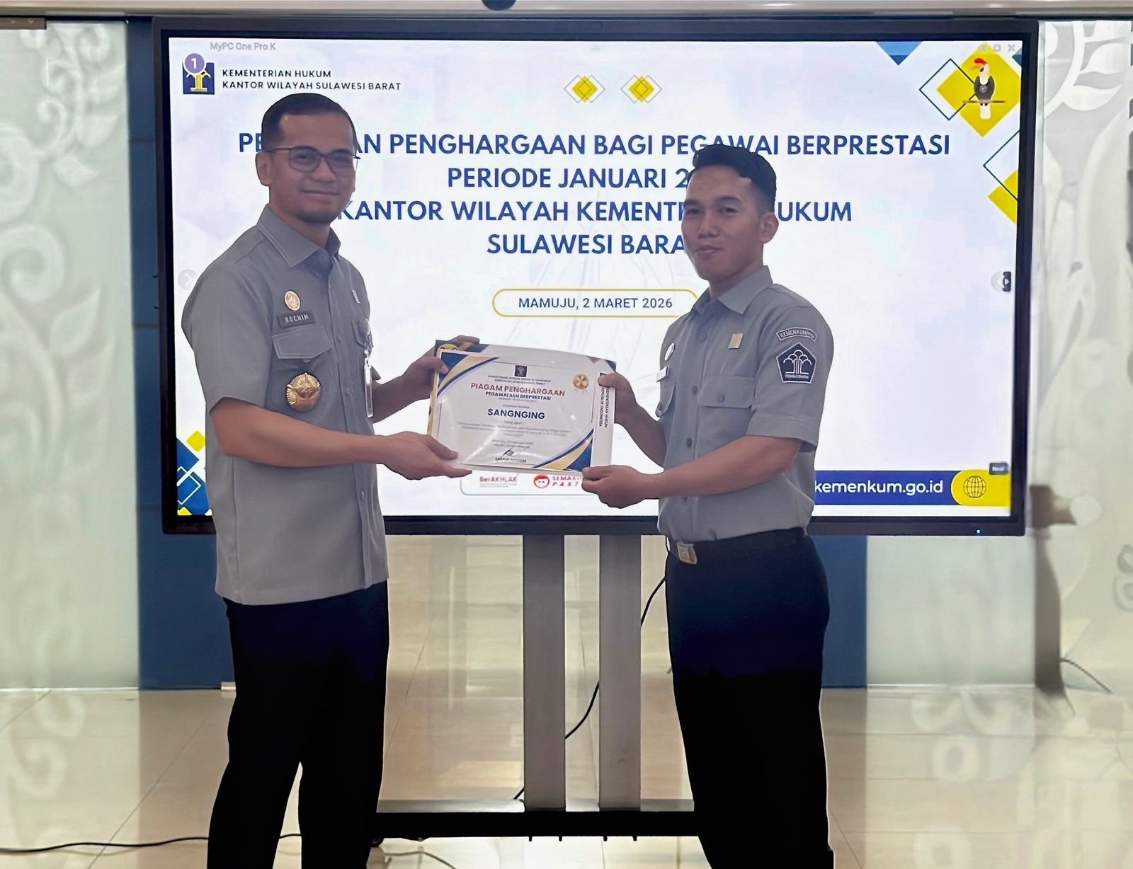 MAMUJU, BKM – Kepala Kantor Wilayah Kementerian Hukum Sulawesi Barat, Saefur Rochim, menyerahkan penghargaan kepada pegawai berprestasi di lingkungan Kanwil Kemenkum Sulbar, Senin (2/3/2026). Penghargaan bulan ini jatuh kepada Sangnging, yang terpilih berdasarkan hasil penilaian objektif dari seluruh rekan sejawat.