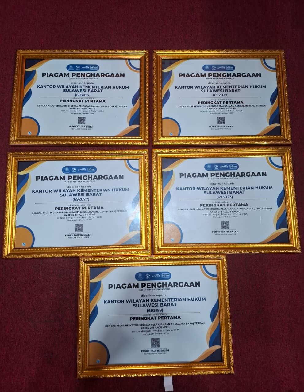 “Penghargaan ini adalah wujud hasil dari kinerja dari seluruh jajaran di Kanwil Kemenkum Sulbar, khususnya tim pengelola keuangan” sambungnya diruang kerjanya (20 Oktober 2025)