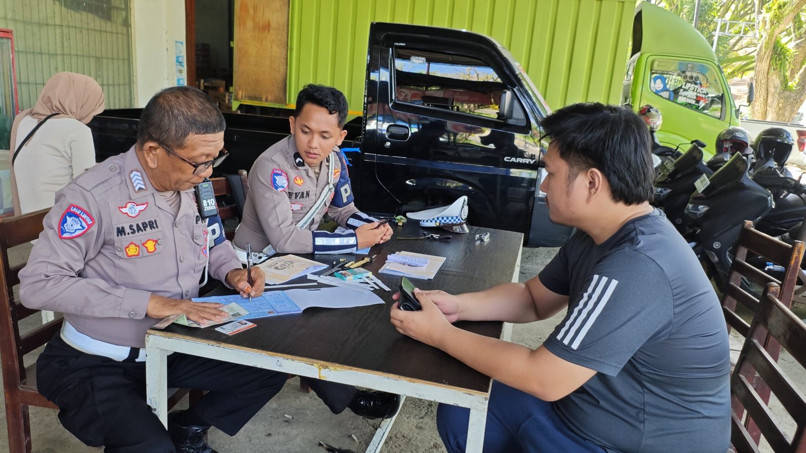 Setelah memastikan keselamatan pengendara, petugas kemudian memeriksa kelengkapan surat-surat kendaraan, SIM dan STNK. Bagi pengendara yang kedapatan melanggar, seperti tidak memiliki SIM dan STNK, atau tidak melengkapi kendaraan dengan spion, plat nomor yang sesuai, dan helm, langsung diberikan sanksi tilang. Namun, proses penindakan tetap dilakukan dengan sopan dan profesional.