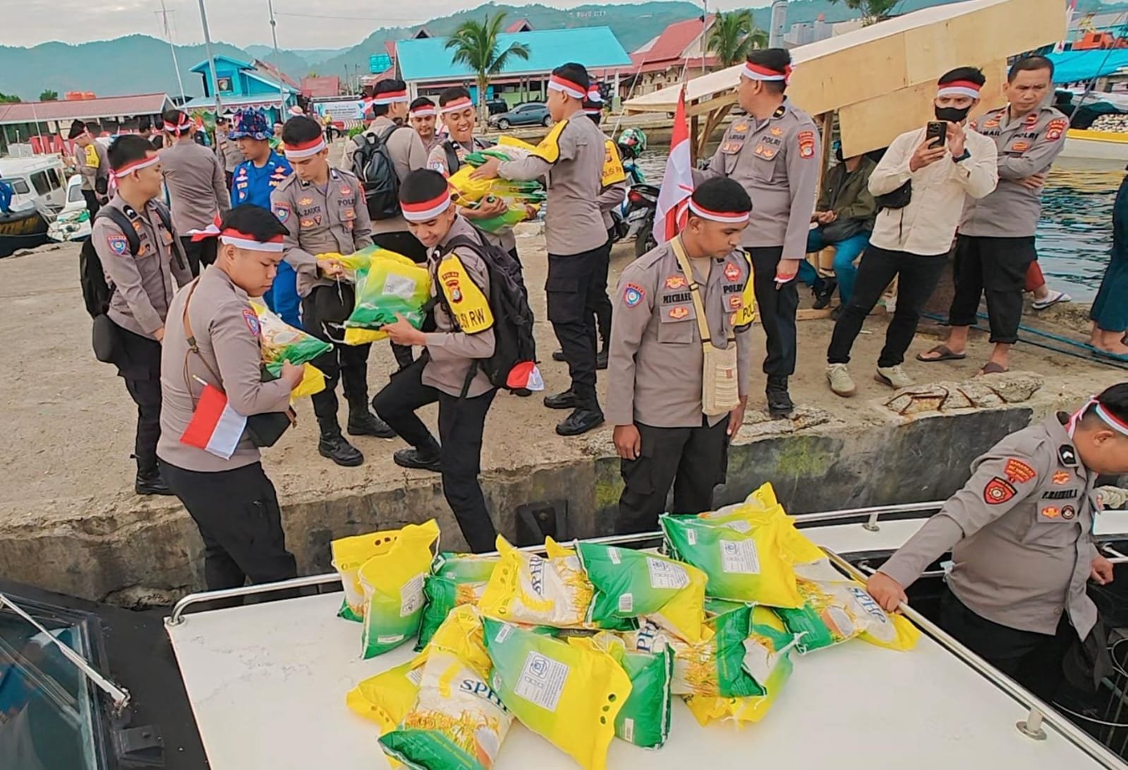 MAMUJU, BKM — Suasana pagi di dermaga Mamuju tampak berbeda. kapal Ditpolair Polda Sulbar bersama kapal Satpolair Polresta Mamuju dan satu kapal nelayan bersandar, siap mengangkut bahan pangan menuju Pulau Karampuang. Mamuju (15/08/2025)