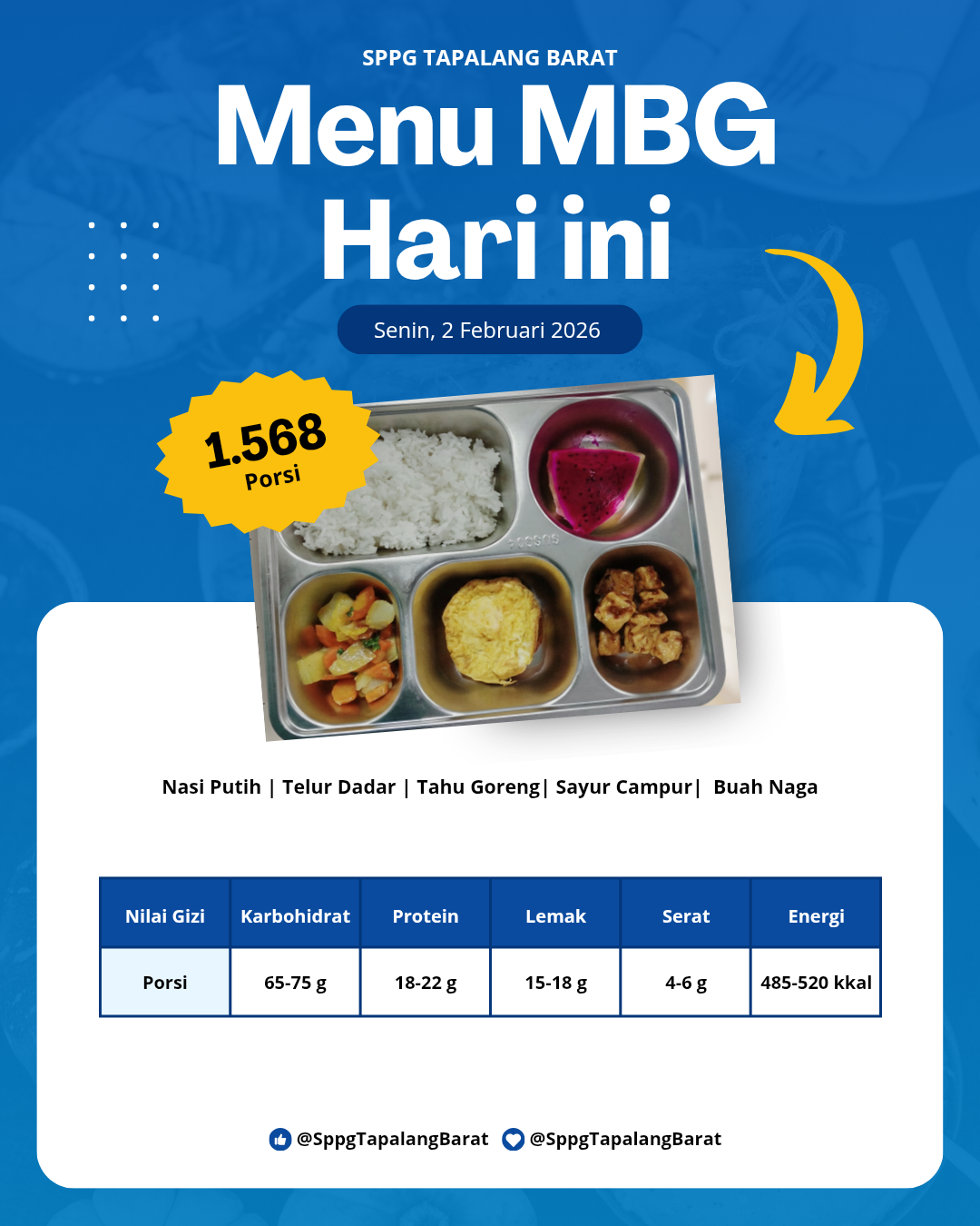 MAMUJU, BKM – Satuan Pelayanan Program Gizi (SPPG) Tapalang Barat terus berkomitmen mendukung kesehatan dan kecerdasan generasi muda melalui pendistribusian menu Makanan Bergizi Gratis (MBG). Pada hari ini, Senin (2/2/2026), sebanyak 1.568 porsi makanan sehat telah disalurkan kepada siswa-siswi yang tersebar di wilayah Kecamatan Tapalang Barat.