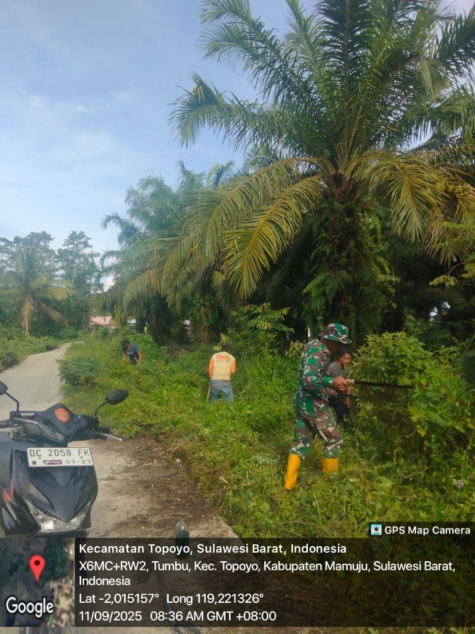 MATENG, BKM – Dalam rangka menjaga kebersihan dan kelancaran akses transportasi masyarakat, Babinsa Koramil 1418-04/Budong-Budong melaksanakan karya bakti pembersihan di pinggir jalan wilayah Kelurahan Galung, Kecamatan Topoyo, Kabupaten Mamuju Tengah. Kegiatan ini difokuskan pada pembersihan rumput liar yang mulai menutupi badan jalan, sehingga mengganggu kenyamanan pengguna jalan. Kamis (11/9/2025).